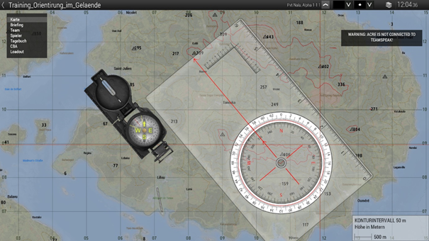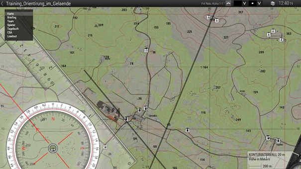 Es besitzt ein Lineal, das auch an das Raster auf der Karte angepasst ist, und eine kleine Skala, mit der sich ein 1x1km-Quadrant in 100m-Schritten einteilen lässt. Wenn man mit gedrückter Strg-Taste am Lineal entlangfährt, kann man damit eine gerade Linie zeichnen.