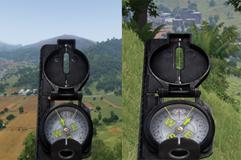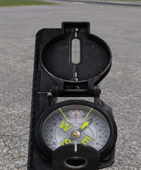 Der Kompass ist die einfachste Methode, mithilfe derer man die Himmelsrichtungen und die eigene Blickrichtung bestimmen kann. Der in Arma verfügbare Kompass ist der im US-Militär verwendete magnetische Kompass mit einem Kompassblatt. Er verfügt über eine Kompassrose mit den vier Richtungen N (Nord), E (Ost), S (Süd), W (West). Außerdem sind Skalen für MIL (0-64 x 100) und Grad (0° bis 360°) angegeben. Bei Gruppe W werden Richtungen (Headings) immer in Grad angegeben.