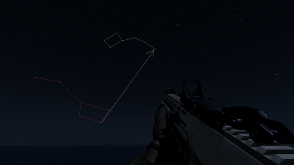 Auf der Nordhalbkugel (also Karten wie Altis, Stratis oder Malden) befindet sich die Sonne morgens im Osten, mittags im Süden und abends im Westen. Auf der Südhalbkugel (also unter anderem auf Tanoa) steht die Sonne dagegen Mittags im Norden. Mithilfe der Uhr ist eine Bestimmung noch genauer möglich. Die Uhr kann mit O geöffnet werden, bei doppeltem Drücken der Taste bleibt sie geöffnet. Für die Nordhalbkugel gilt: Die Uhr so drehen, dass der Stundenzeiger zur Sonne zeigt. Den Winkel zwischen dem Stundenzeiger und der 12 halbieren und zwar vormittags den Winkel vor (links) der 12 und nachmittags den Winkel nach (rechts) der 12. Die Halbierungslinie (Winkelhalbierende) zeigt dann nach Süden. Die Methode ist leider nicht auf allen Karten aus Mods zuverlässig.