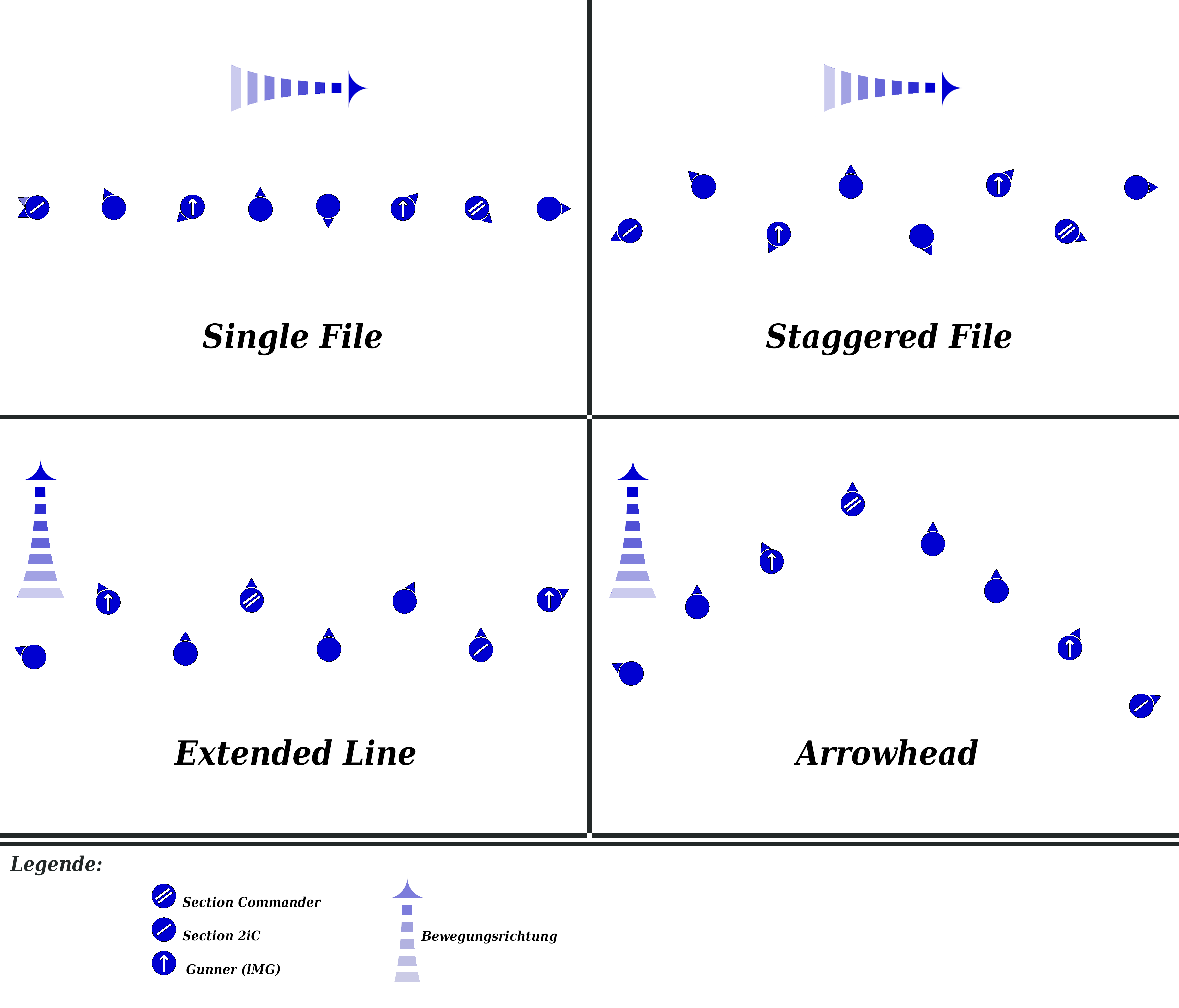 Ist die einfachste Formation für Sections. Sie dient als Formation für Verlegungen in unübersichtlichem Gelände, wenn Geschwindigkeit oder Tarnung wichtiger als Eigensicherung ist und Feindkontakt eher unwahrscheinlich.