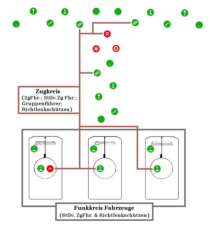 Teilnehmer des Funkreis Fahrzeuge sind mindestens der Stellvertretende Zugführer und die Richt(-lenk-)schützen, optional können die Kraftfahrer teilhaben.