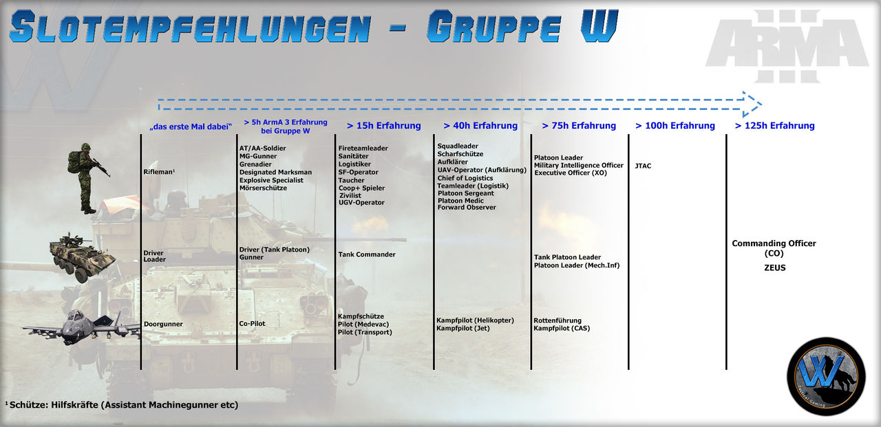 Bei Gruppe W gibt es Empfehlungen, ab wann man bereit ist, einen bestimmten Slot in einem Event zu belegen. Die Angegebene Spielzeit bezieht sich auf Events, nicht Abendmissionen.